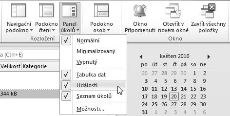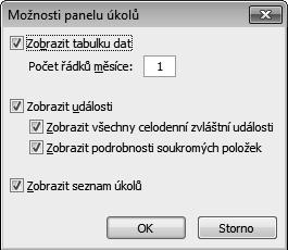 V dialogu Možnosti panelu úkolů můžete také potlačit či povolit zobrazení událostí nebo vybrat, které události mají být zobrazovány. Dále je možné potlačit nebo povolit zobrazení seznamu úkolů.