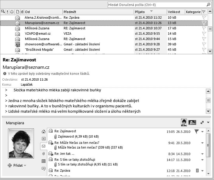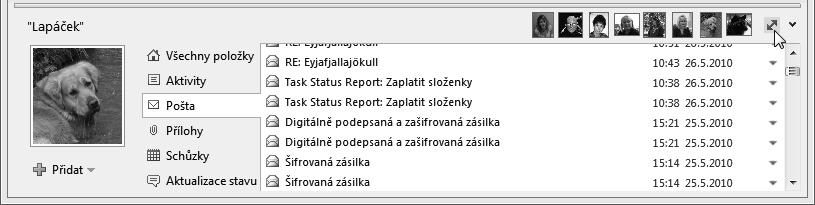 Pošta – zobrazí se položky týkající se nejčerstvějších zpráv, které jste si s tímto kontaktem vyměnili.