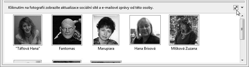 Pokud položka aplikace Outlook zahrnuje kontakty na více osob (například zásilka s několika spoluadresáty či žádost o schůzku), zobrazí se v záhlaví podokna osob obrázky dalších osob. Umístíte-li nad obrázek kurzor myši, zobrazí se jméno osoby a název složky s kontakty, ve které jsou o ní uloženy informace. Klepnutím na obrázek se v podokně osob zobrazí informace o sociální síti osoby, pokud je k ní dotyčná osoba připojena.
