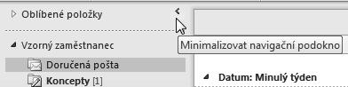 Navigační podokno můžete také minimalizovat a zvětšit si tak užitečný pracovní prostor. Klepněte na tlačítko Minimalizovat navigační podokno v jeho pravé horní části a okno se zúží do minimální možné šířky. Do původní podoby jej obnovíte pomocí analogicky umístěného tlačítka Rozbalit navigační podokno.
