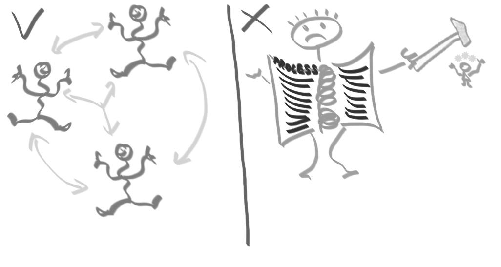 Je známým faktem, že spolupracující týmy mají lepší výsledky než skupiny individuálně pracujících jednotlivců. Procesy a nástroje jim pomáhají dosáhnout výsledků, ale nejsou pro jejich úspěch nijak klíčové. Pojďme se podívat na dva odlišné týmy. V prvním máme 10 profesionálů, kteří si vytvořili vlastní nástroje a pracují v silně kolaborativním prostředí, ve druhém máme 10 vývojářů, kteří pracují v přesně definovaném procesním prostředí s nejlepšími nakoupenými nástroji, ale bez interakcí a spolupráce.