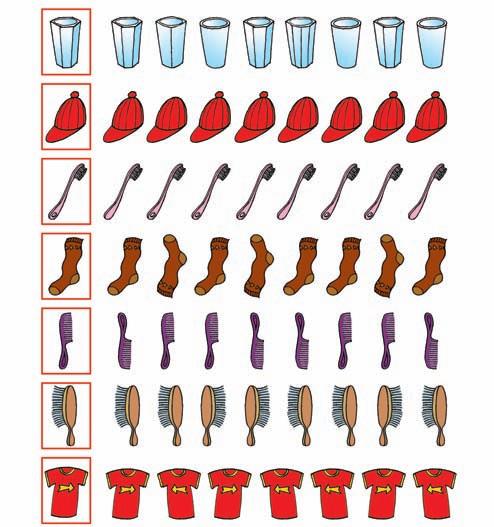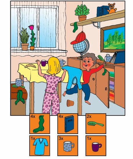 Figura a pozadí, zrakové rozlišování. Dítě necháme ve velkém obrázku vyhledávat počet předmětů nakreslených na spodních obrázcích.