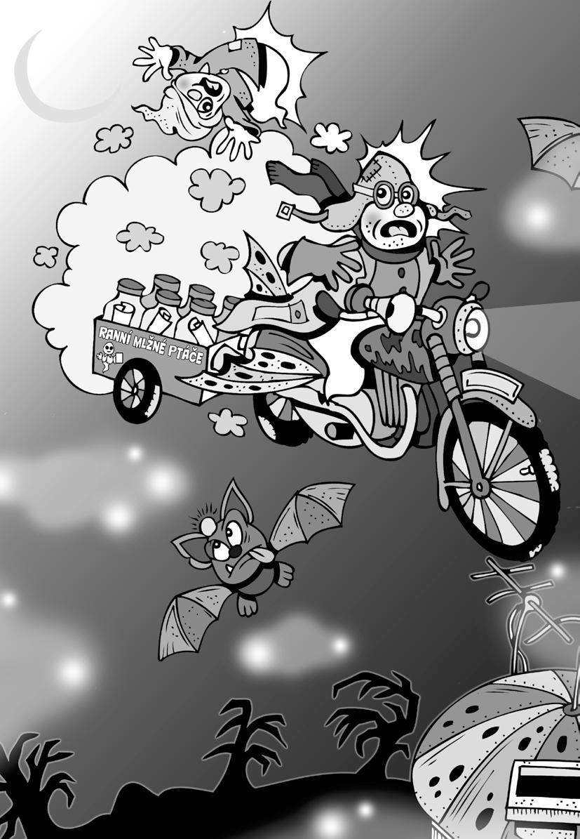 Jediný dobrý důvod, proč se budit za svítání, byla ranní mlha, úžasná, čerstvá mlha s chutí prvních paprsků. A právě na takovou mlhu Bubi netrpělivě čekal. Když se konečně dostal z věšáku a nenápadně zametl střepy z rozbitého zrcadla pod skříň, vyrazil před dům. Tam chvíli lítal doprava a doleva, aby si zkrátil dlouhou chvíli, a zrovna když uvažoval, že půjde vyhlížet z antény, objevilo se v dálce v ranním oparu duší vozidlo. Byla to mlžanská motorka s připevněnými křídly, které se říkalo Mlhotryska nebo taky Klouzek, krásně totiž klouzala vzduchem. Za motorkou byl připojený velký vozík, který měl na straně výrazný tmavě modrý nápis „Ranní mlžné ptáče“. Vedle toho byl namalovaný duch v pyžamu, co drží hrnek s čerstvou ranní mlhou, který navíc příhodně zdobil obrázek ptáčete. Ve vozíku lehce poskakovalo několik objemných, vzorně vyrovnaných skleněných bandasek. Ranní mlžné ptáče bylo jedinou letitou duší společností rozvážející ranní mlhu. Vpředu na sedátku motorky seděl Mlžan ve vlajícím tmavomodrém saku s velikánskými motorkářskými brýlemi na nose, pevně svíral řídítka a popiskoval si nějakou píseň. Mířil přímo k Ducháčkovic domu.