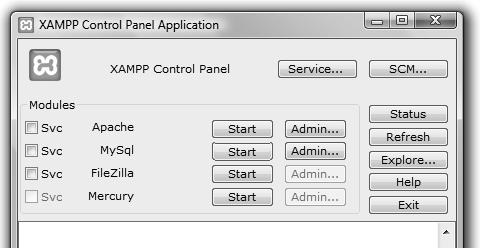 Pokud jsme server Xampp nenainstalovali jako službu, a není tudíž ještě spuštěný, klepneme na ikonu Xampp Control Panel. Pokud ji nemáme na ploše, vyhledejme ji v nabídce Start XAMPP for Windows Xampp Control Panel. Otevře se ovládací panel serveru (jako na obrázku 1.3).