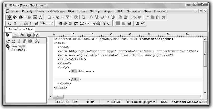 Klepneme na příkaz Soubor Nový. Otevře se okno, ve kterém je poměrně dlouhý seznam podporovaných typů souborů. Vyberme si třeba HTML multihighlighter. Otevře se nový soubor a v něm připravená základní šablona. Napišme mezi značky <body> a </ body> následující kód: