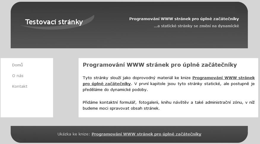 Podívejme se na ukázkové testovací stránky, které postupně předěláme do dynamické podoby. Najdeme je v adresáři /01/ mezi zdrojovými kódy doprovázejícími tuto knihu. Pokud jste si server nainstalovali stejně jako já, je cesta k těmto stránkám C:\xampp\ htdocs\kniha\01\. Jak vidíme, v tomto adresáři máme: tři statické stránky: index.html, o-nas.html a kontakt.html, adresář obrazky, ve kterém jsou obrázky použité na těchto stránkách, a adresář css, v němž je jenom jeden soubor style.css, který popisuje vzhled stránek.