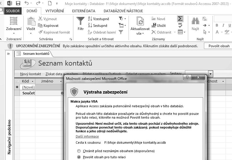 Obrázek 1.10: Po prvním spuštění databáze ze šablony se zobrazuje Upozornění zabezpečení a přes kartu Soubor můžete zobrazit i Výstrahu zabezpečení