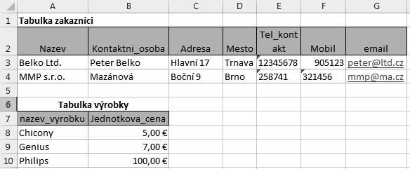 Každá obsahuje pole jen k určité skupině informací. Tabulka zákazníků bude mít pole kontaktní osoba, adresa, město, PSČ, telefon a e-mail. Výrobky budou obsahovat údaje o výrobcích – kód, název, cena, poznámka. Podobně budou realizovány i další tabulky.