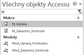 Obrázek 1.6: Seznam maker a modulů v databázi zobrazený po filtrování v navigačním podokně