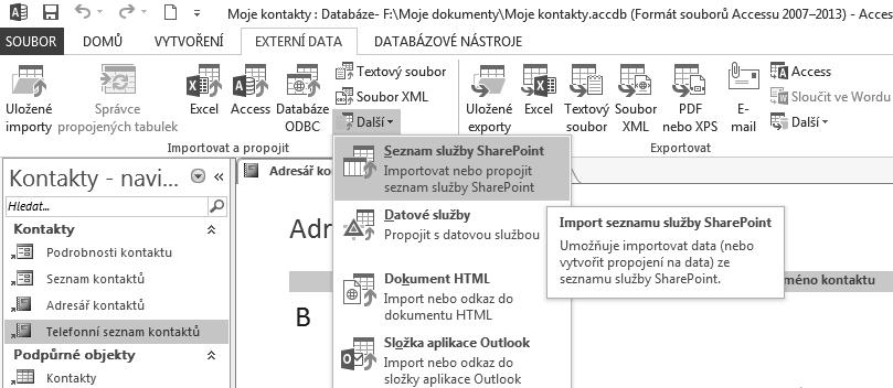 jsou dostupné nástroje na import z Excelu, webu, textového souboru, Accessu, ODBC – SQL serveru, SharePointu a dalších. Podobně můžete z vaší databáze exportovat údaje do jiného formátu. Postupy využijete i tehdy, pokud nevytváříte databázovou aplikaci, jen potřebujete Access využít ke zpracování a analýze údajů z jiných aplikací. Některé typy propojených údajů jsou jen k zobrazení, některé můžete měnit na obou místech a synchronizují se obousměrně.