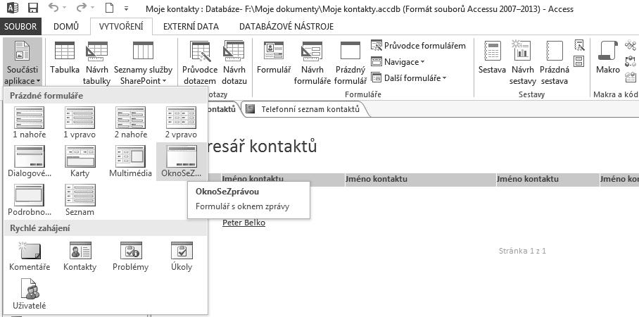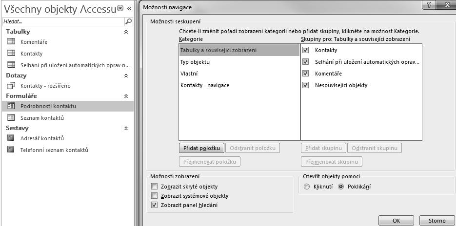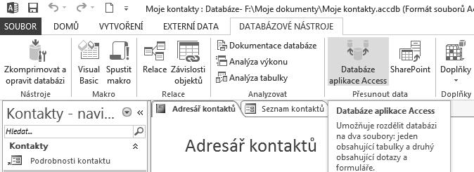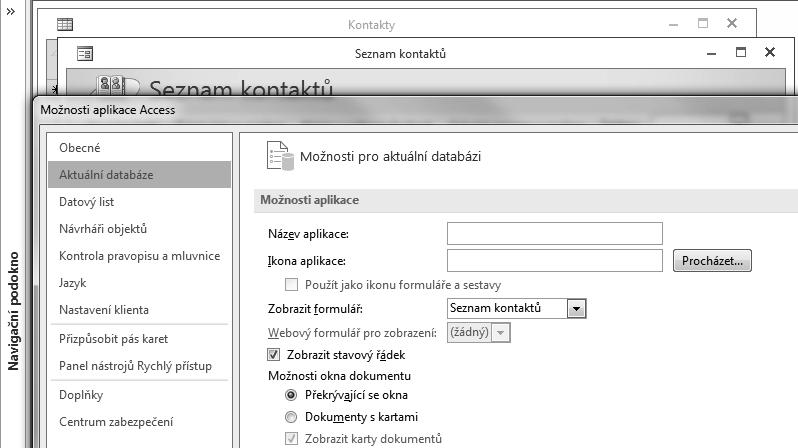 Uživatelé starších verzí Accessu znají zobrazování jednotlivých databázových objektů v samostatných oknech. Verze 2013/2010 zobrazuje objekty na kartách v horní části obrazovky. V případě, že budete potřebovat ve vlastní databázi zobrazovat objekty v oknech, postupujte v databázi Moje kontakty následovně: