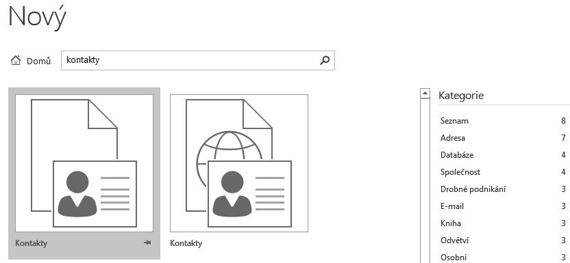 1. Spusťte Access a na Úvodní obrazovce vyberte šablonu Kontakty. Pozor, dostupné jsou dvě šablony kontaktů, jedna jako webová aplikace a druhá jako lokální. Vyberte lokální, jejíž ikona má v pozadí dokument bez schématu zeměkoule.