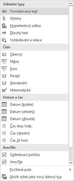 Obrázek 1.26: Seznam datových typů dostupný v zobrazení datového listu