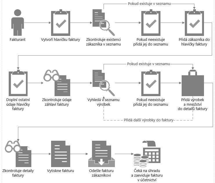 Následně je potřeba sepsat, jaké úlohy se realizují, pokud se fakturuje novému zákazníkovi, jaké úlohy probíhají při opakované fakturaci existujícímu zákazníkovi, co se dělá, pokud v databázi není výrobek, který se má fakturovat. Mohly by vypadat následovně: