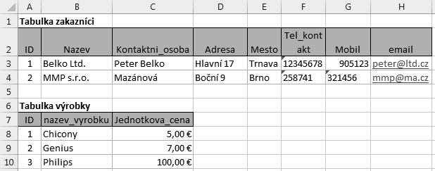 Obrázek 1.25: Rozdělené tabulky zákazníků a výrobků doplněné o jednoznačná identifikační čísla – primární klíče