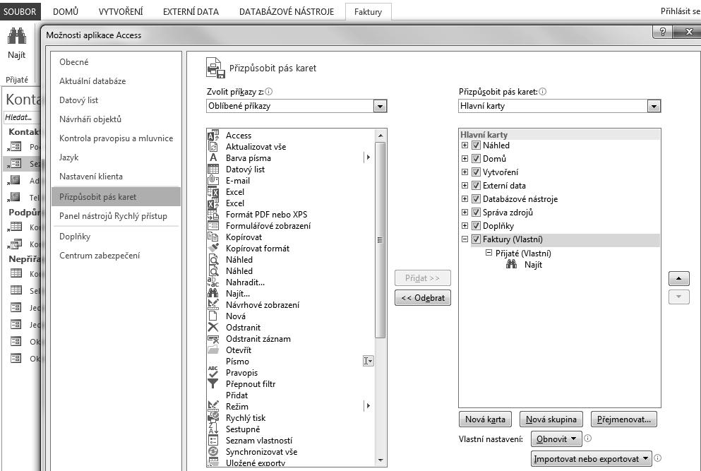 7. Vlastní karty odstraníte přes Soubor Možnosti Přizpůsobit pás karet. Klepněte v seznamu na vlastní kartu Faktury pravým tlačítkem myši a zvolte Odebrat. Karta se odebere, okno možností zavřete klepnutím na tlačítko OK