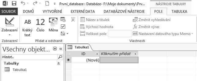 3. Klepněte na tlačítko Vytvořit, které zobrazí prostředí Accessu s otevřenou novou prázdnou tabulkou s názvem Tabulka1. Tuto byste následně upravili a vytvořili i další objekty podle návrhu databáze. Postup bude popsán v další části.