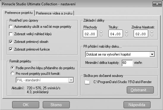 Základní délky umožňují nastavení základní časové délky v sekundách pro použití přechodů, titulků a změny hlasitosti. Tyto délky lze pak individuálně měnit během zpracování projektu.