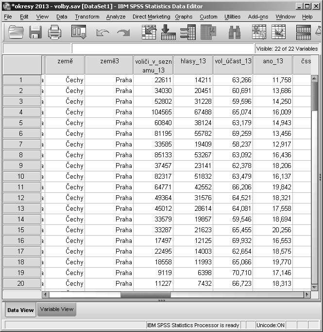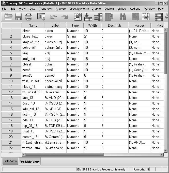 Okresy 2013.sav – vybrané demografické údaje z let 2009 a 2012 v okresech a okresní volební zisky parlamentních stran ve volbách do PS Parlamentu ČR 2010 a 2013