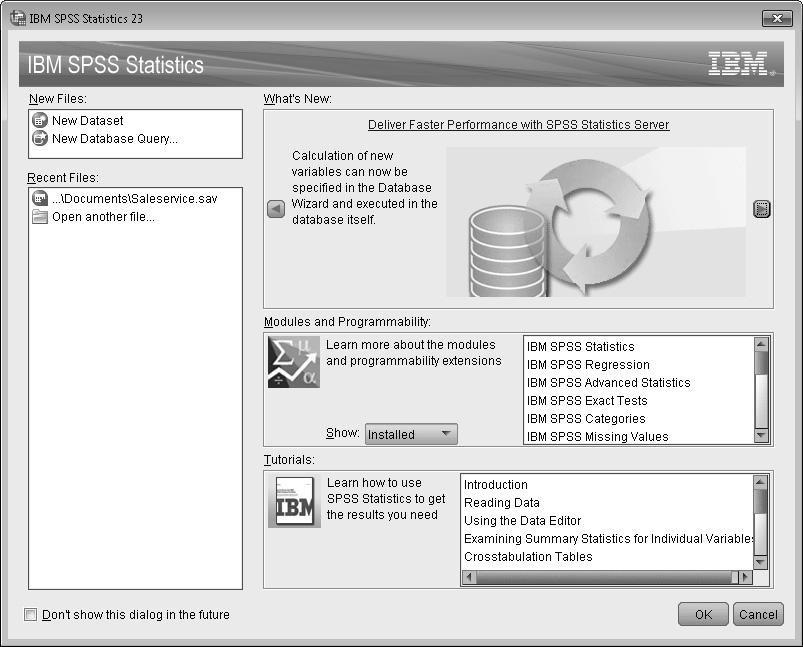 Práce s programem IBM SPSS Statistics se v mnohém podobá běžné praxi, na kterou jsme zvyklí ze standardních programů pro OS Windows. Ovládá se pomocí menu, oken a ikon. Program je ovšem uzpůsoben speciálnímu úkolu, pro nějž byl vytvořen. Nabídková okna obsahují statistické postupy a jsou optimálně uzpůsobena analytické práci. Doprovodný syntaktický jazyk je jednoduchý a uživatelsky příjemný.