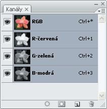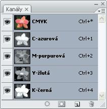 Obrázek1.16 Výtažkování na počítači. Původní obraz v režimu RGB se skládá ze tří kanálů, převodem do režimu CMYK se obraz rozloží na čtyři kanály tiskových barev. Na ukázce je zobrazena paletka Kanály v Adobe Photoshopu.