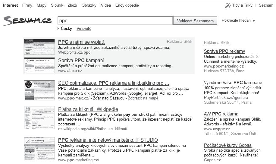 Placené výsledky hledání – Seznam zobrazuje placené výsledky hledání nad přirozenými výsledky a vpravo (a někdy také pod výsledky hledání). Označeny jsou jako Reklama Sklik. To je ono místo, které bude zájmem této knihy. Reklamu sem dodává PPC systém zvaný Seznam Sklik, jehož se naučíte díky této knize využívat ve svůj prospěch.