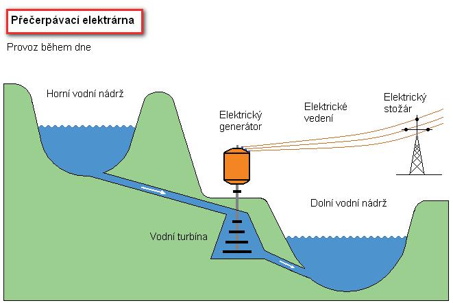 přebytku elektrické energie z jaderných elektráren využívají. Vodní turbína může pracovat i v obráceném režimu jako čerpadlo (tzv. reverzní turbína) a generátor se po připojení napětí stane elektromotorem. Ve dne voda z horní nádrže proudí na turbínu a roztočený generátor produkuje elektřinu. V noci elektromotor pohání čerpadlo, které čerpá vodu z dolní nádrže zpět do horní nádrže, aby mohla ve dne znovu pohánět turbínu.