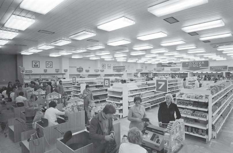 Ale i ti ostatní vždycky něco získali, i když si na některé dobroty museli nechat zajít chuť. Ve městech nebo i na větších vesnicích lidé získávali hlavní část potravin v samoobsluhách. Ta první u nás začala fungovat v roce 1955 v Praze na Žižkově v Husitské ulici a od té doby samoobsluh rychle přibývalo jak hub po dešti. Staly se symbolem nové éry nakupování, ačkoliv z dnešního hlediska se jednalo o malé krámky – i velkoprodejny budované zejména na sídlištích v sedmdesátých a osmdesátých letech se nám dnes zdají jako běžné supermarkety nevelkých rozměrů. Jako příklad může sloužit prodejna ze seriálu Žena za pultem (1977, rež. Jaroslav Dudek), i když vedoucí této samoobsluhy v podání nezapomenutelného Vladimíra Menšíka v prvním díle hrdě vypočítával, že mají pět pokladen, tři mrazáky, oddělené pulty pro zeleninu, maso a uzeniny či lahůdky, sprchu k šatnám, a dokonce jako hlavní trumf – i mramorovou podlahu. Tedy pravda, mramorovou podlahu bychom v dnešních hypermarketech hledali marně. Omezené rozměry tehdejších samoobsluh souvisely pochopitelně s rozsahem sortimentu. I když v mnoha případech měli kupující na výběr několik druhů určitého zboží, v porovnání se současností byste si v takovém obchodě připadali jako u chudých příbuzných.