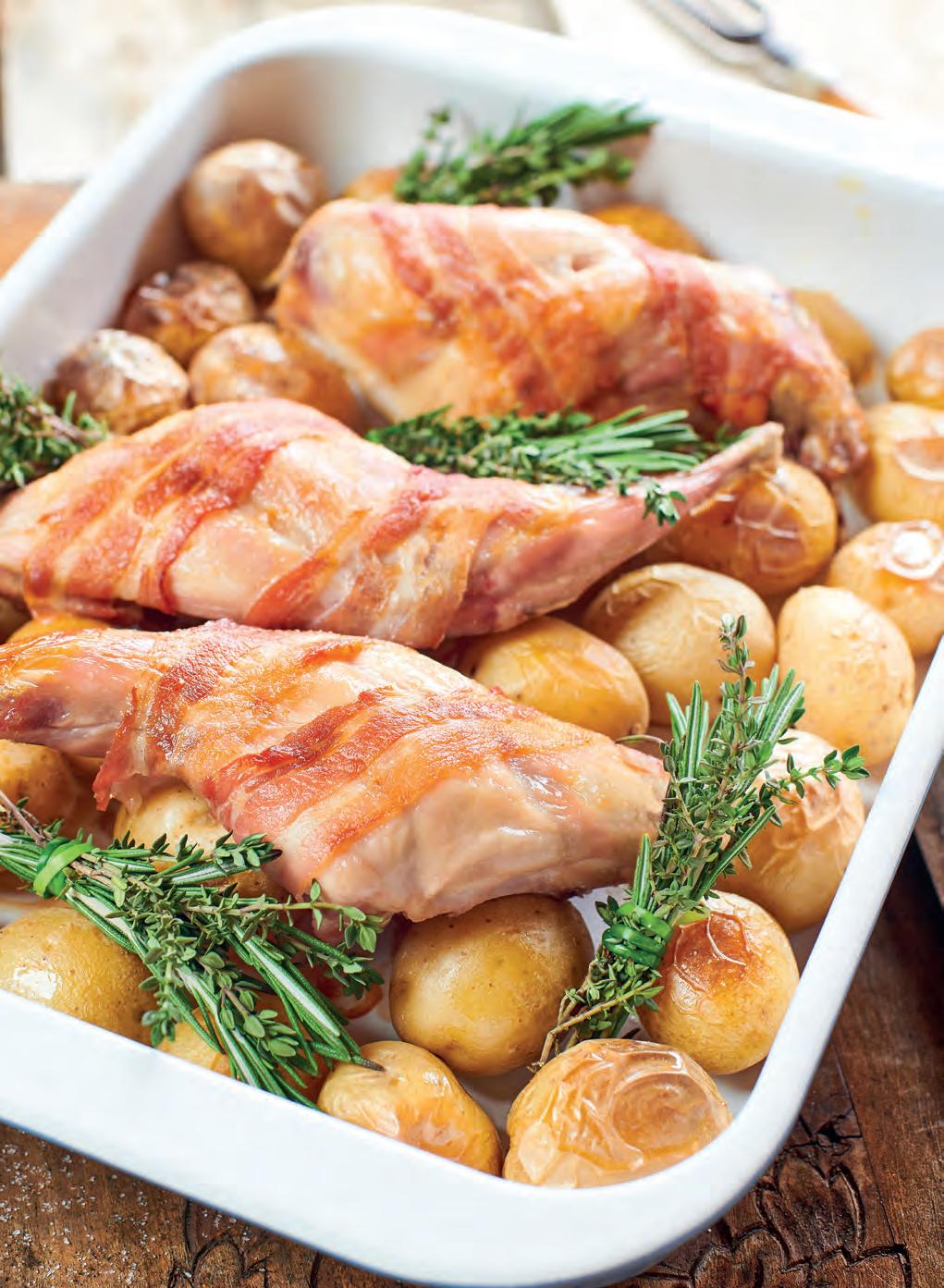 4 králičí stehna 200 g slaniny směs bylinek (tymián, rozmarýn, oregano atd.)