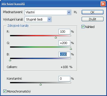 4. Ve skupinovém rámečku Zdrojové kanály přetáhněte posuvník G (pro zelený kanál) na hodnotu +200 a posuvník B (pro modrý kanál) na hodnotu -200. Posuvník R (pro červený kanál) ponechte na hodnotě 100 a dialogové okno potvrďte. Pokud zvolíte jiné hodnoty červeného, zeleného a modrého kanálu, dbejte na to, abyste v součtu dostali celkem 100 %.