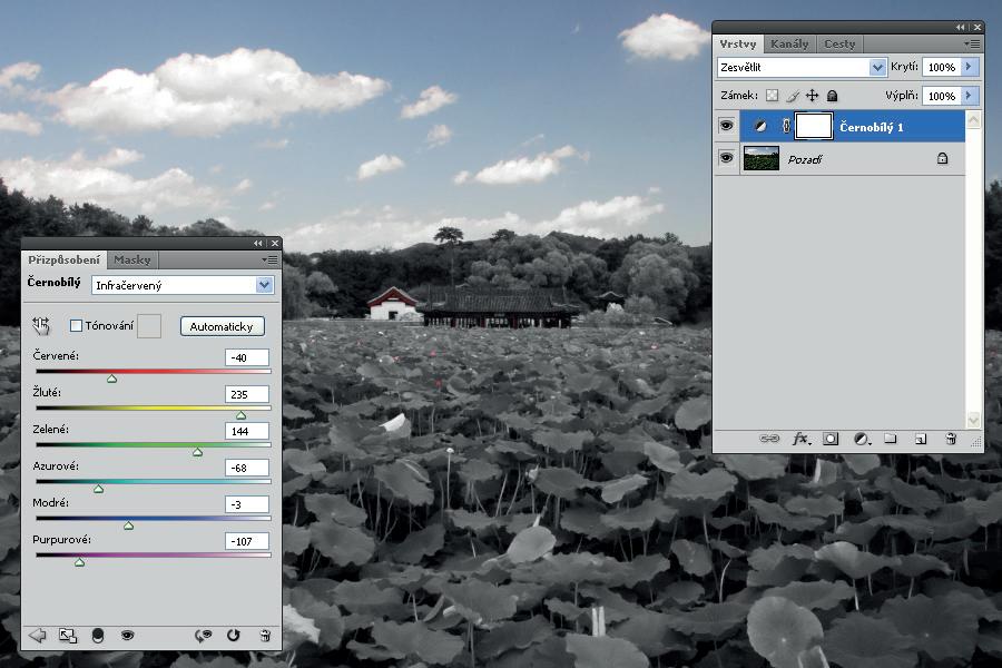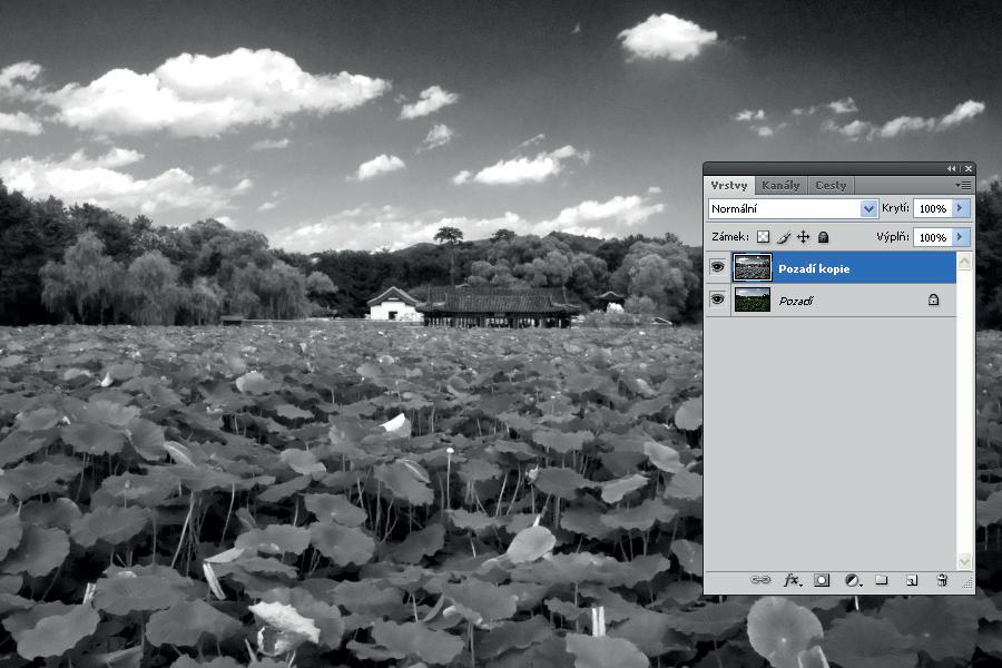 Uvedeným postupem získáte černobílou fotografii s infračerveným efektem. Můžete ji ponechat buď v tomto stavu nebo pokračovat dalšími úpravami a vytvořit barevný infračervený efekt, který je založen na režimu prolnutí obou vrstev.