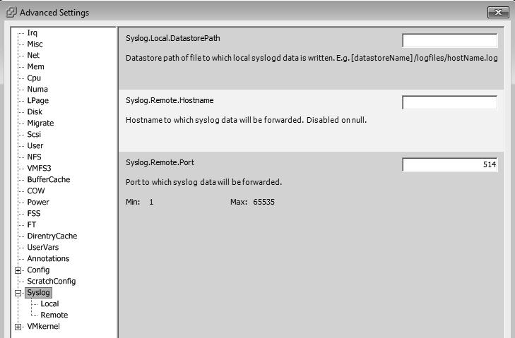 Na ESX hostiteli můžete konfigurovat soubor /etc/syslog.conf. Na hostiteli ESXi můžete použít vSphere klienta pro nastavení následujících možností: