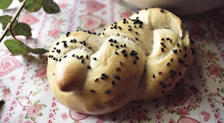 pěkně a lákavě nazdobit. Buď umotat jednoduché housky, uzlíky, květinky atp. (viz např. str. 108) nebo pečivo před pečením (po pomašlování vejcem nebo postříkání vodou) posypat semínky či na každý kousek položit lístek jedlé bylinky (list petržele, šalvěje, bazalky, malinkou část větvičky tymiánu nebo rozmarýnu), který se na pečivu zapeče, zůstane tam i po upečení a zdobí jej.