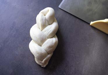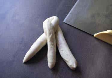 • Nejjednodušším pletením housek se mi zdá poslední způsob, který nabízím: Bulku rozválíme na krátký a širší pramen, který podélně rozřízneme na třetiny tak, že jeden konec nedokrojíme (viz fotopostup) a spleteme do copu. Není třeba se bát toho, že prameny nejsou úplně kulaté, dalším kynutím na plechu a pak i v troubě se hrany zaoblí a téměř nepoznáte, že prameny byly krájené a ne válené.