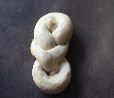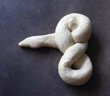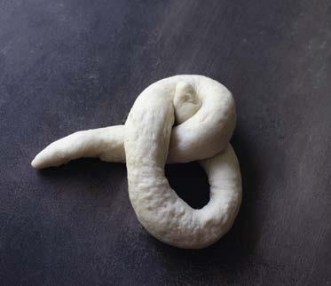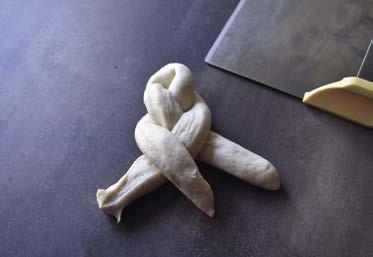 • Z kousků těsta uděláme kratší hady (pramínky) a každý stočíme a provlékneme do úplně jednoduchého uzlu s dvěma trčícími konci pramenů (jako klasický uzlík na šňůrce) a dáme vykynout na plech. Podobně jednoduše tvarované jsou tyto kopřivové uzlíky (str. 68).