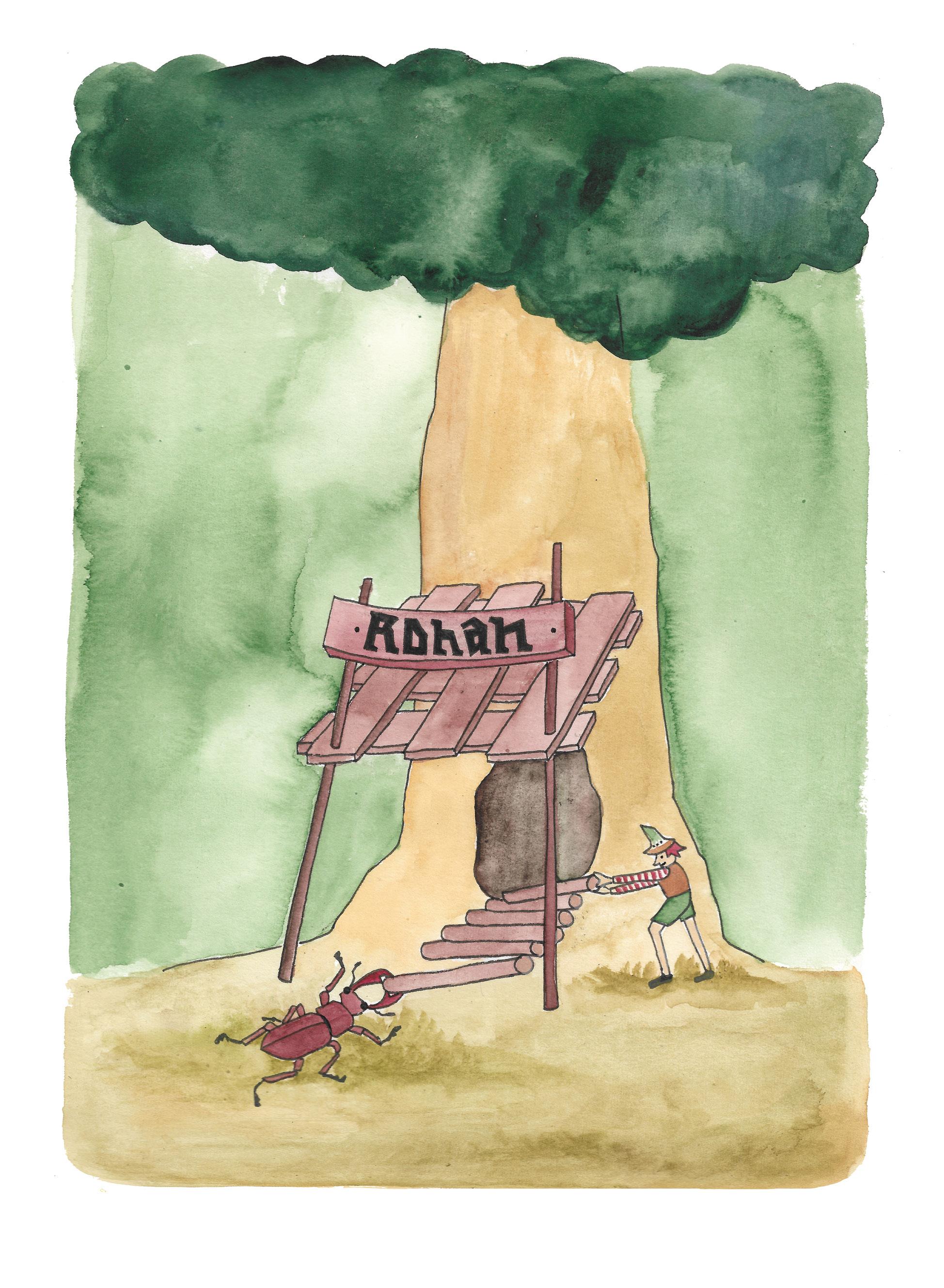 „Protože mi déšť vyplavil chaloupku. Celou mi ji zničil. Zbyla mi z ní jen hromada dříví. Teď abych ji stavěl znovu,“ hořekoval brouk Rohan. „A věř mi, že to není žádná legrace takovou chaloupku vystavět. Nadřel jsem se na ní několik dní.“