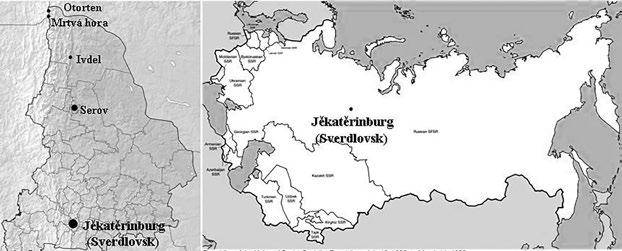 Cesta na sever: základní informativní mapa Sverdlovské oblasti. Mapa vlevo: autor: Nzeemin, CC BY-SA 3.0 (odbarveno, vpravo oříznuto, do slepé mapy doplněna poloha měst a hor). Mapa vpravo: autor: Golbez, CC BY-SA 4.0 (do mapy doplněna poloha Jekatěrinburgu)