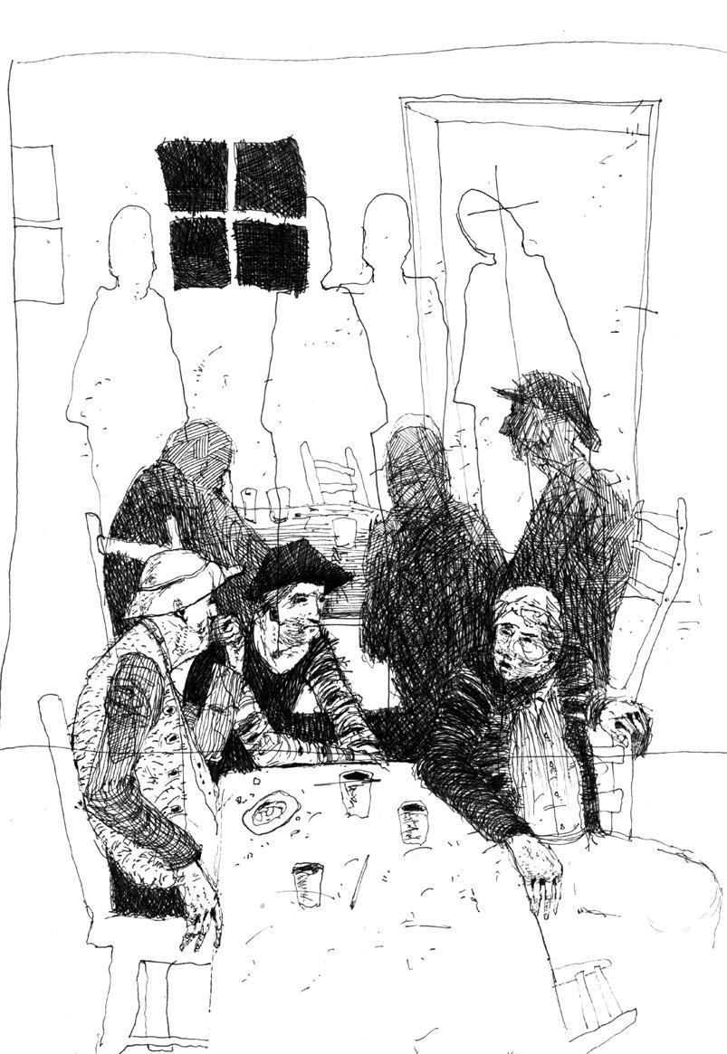 Metzler a Sievers u stolu. Stranou u ohně dva jezdečtí pacholci. Hospodský.