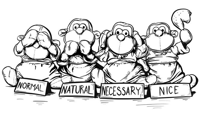 Melanie Joy také tvrdí, že pro udržení karnismu je zcela zásadní systém 3 N. Jíst maso je normální (normal), přirozené (natural) a nezbytné (necessary). Někdy se přidává čtvrté, podle mě stěžejní, N – nice (příjemné). Jde o stejné zdůvodnění, které bylo v minulosti použito u jiných systémů typu otrokářství nebo nerovnoprávnosti žen. Dokud systém funguje, jen velmi zřídka se nad ním někdo pozastaví, ale po kolapsu dané ideologie jsou tyto argumenty často označeny za absurdní. Lidé mají tato tři N internalizována a používají je jako univerzální pravdu. Neurčují jen směr chování, jejich účelem je také snížit psychický diskomfort, který by lidé mohli prožívat při konzumaci masa.