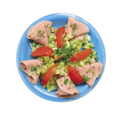 6 Na talíř naberte ochucený salát, pokapejte jej troškou olivového oleje, vše obložte kornoutky šunky a posypte omytou a nasekanou natí kadeřavé petrželky nebo řeřichy.