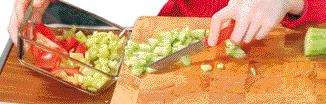 • Při krájení cibule doporučuji, aby prsty, které ji drží, byly postavené (prohlédněte si obrázek číslo 2 na straně 13). Je to kvůli bezpečnosti. Kdyby totiž sklouzl nůž až k prstům, svezl by se po nehtech a nepořezali byste se.