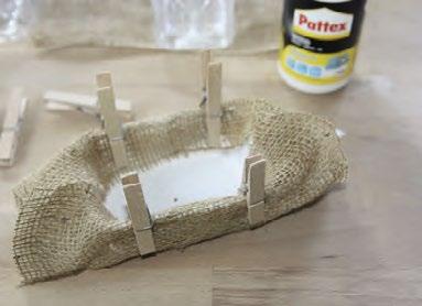 6. Květináče polepíme připravenou pytlovinou a lepidlo necháme důkladně zaschnout. V lepení pytloviny přes horní okraj si pomůžeme kolíčky na prádlo, kterými látku do zaschnutí lepidla zafixujeme.