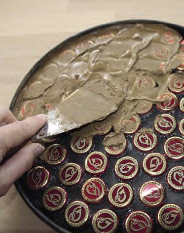 2. V misce rozmícháme spárovací hmotu na dlaždice a pomocí špachtle ji naneseme na nalepená víčka. Dobře ji zatlačíme do všech mezer a hmotu necháme lehce zavadnout.