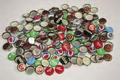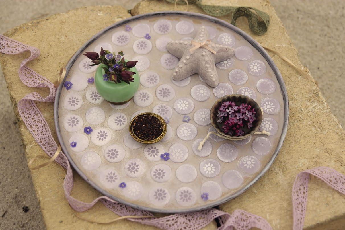 Co budeme potřebovat: • kovovou podložku na pečení (např. starý plech nebo nízkou formu) • • kovová víčka (zde od piva a limonád) • tavicí pistoli • špachtli • hadřík • • spárovací hmotu na dlaždice (zde béžovou) • akrylové barvy (zde bílá a fialová) • • malý molitanový váleček • štětec • bezbarvý lak • • šablonu kytičky nebo razničku na šablonu a kancelářský papír • 1. 2.