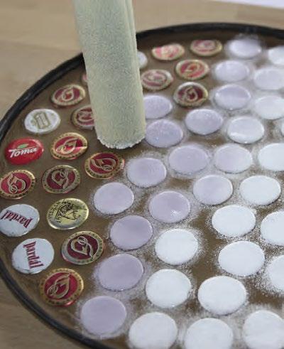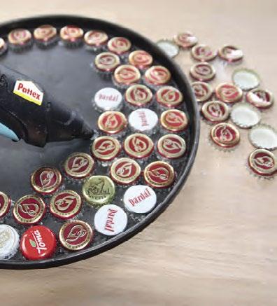 1. Podložku očistíme od prachu a zbavíme ji mastnoty. Potom na ni postupně tavicí pistolí začneme nalepovat kovová víčka jedno vedle druhého. Mezi některými můžeme udělat i větší mezery, jak nám to zrovna vyjde.