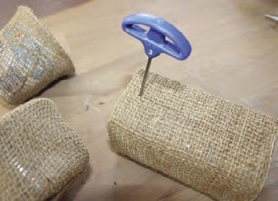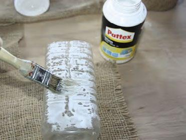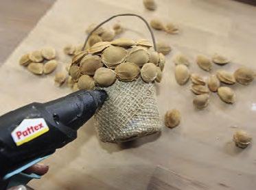 12. Připravené přírodniny nalepíme tavicí pistolí na obaly s pytlovinou.