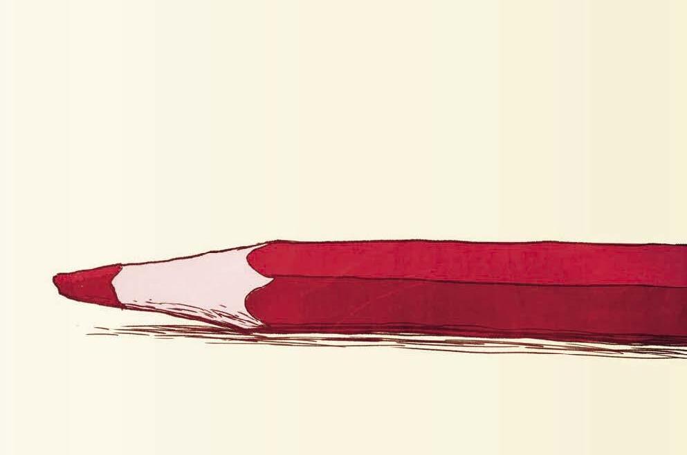 dům. Ořezaná červené pastelka se připojí kdlouhým červeným tahům střechy.