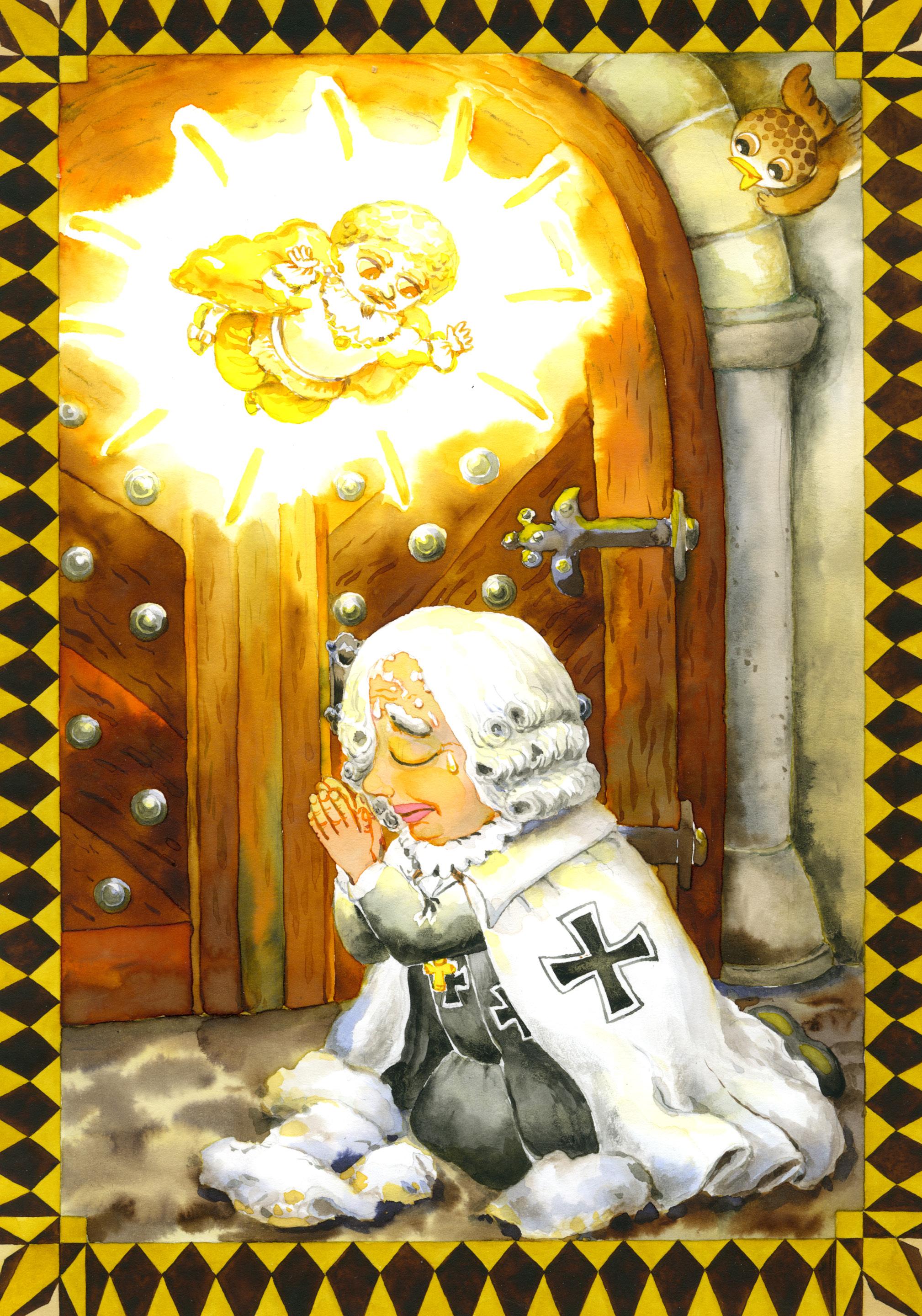 Světýlko pak začalo od domu pomalu ustupovat. Velmistr se šoural po kolenou za ním, až dorazili na hřbitov. Tam velmistr silnými slovy zaklel ducha do hrobu.