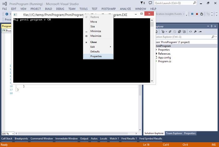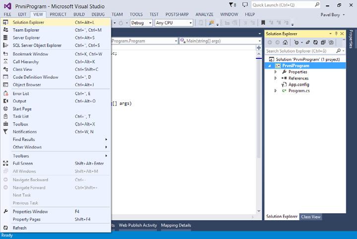 Toto okno vám ukáže, které projekty se v Solution nachází, a můžete zde otevírat jednotlivé soubory obsahující zdrojové kódy a ty editovat. Zkuste si v Solution Explorer otevřít soubor Program.cs, do kterého jsme napsali náš první program.