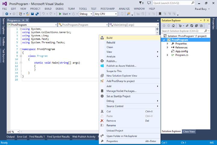 Víme, že Solution může obsahovat více projektů. Z každého projektu obsaženého v Solution se vytvoří jeden spustitelný soubor s příponou .exe a několik dalších souborů, které nejsou nutně zapotřebí pro samotné spuštění programu, a nebudeme se jimi proto v této knize zabývat. Pokud máte vytvořenu Solution obsahující jeden projekt z kapitoly Náš první program v jazyce C# v umístění C:\temp\PrvniProgram, naleznete spustitelný .exe soubor programu zde: C:\temp\PrvniProgram\bin\Debug\PrvniProgram.exe. Zkuste si tento soubor najít a program spustit. Měla by se vám zobrazit konzole, na kterou se vypíše text stejně, jako když jsme program spouštěli pomocí Debug Start Debugging přímo z Microsoft Visual Studia. Další možností je provést Build nad konkrétním projektem. Můžeme jej spustit buď z menu Build pomocí příkazu Build PrvniProgram (nebo jiný název projektu), nebo z kontextového menu nad projektem v Solution Explorer. Klikněte pravým tlačítkem na název projektu v Solution Explorer a vyberte možnost Build.